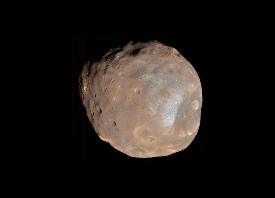 Orbiting a mere 3,700 miles (6,000 kilometers) above the surface of Mars, Phobos is closer to its planet than any other moon in the solar system. Mars' gravity is drawing in Phobos, the larger of its two moons, by about 6.6 feet (2 meters) every hundred years. Scientists expect the moon to be pulled apart in 30 to 50 million years.