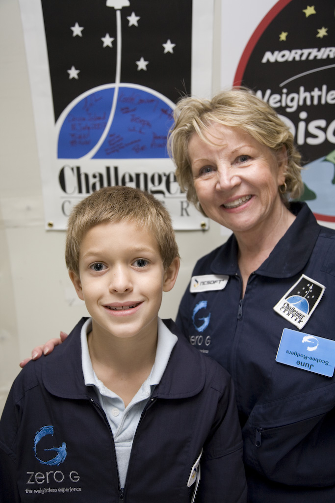 A month after our trip I presented June with a Challenger Center banner that we took with us to Devon Island. The next day, Barbara Morgan addressed a group of students (from orbit) at the Challenger Center in Alexandria, Virginia. Last week, June had a chance to fly on a privately chartered flight of G Force One in Austin, Texas. Leroy Chiao had a chance to say hello to her before her flight. Aboard during the flight was Matt Reyes - and the banner we took to Devon Island.