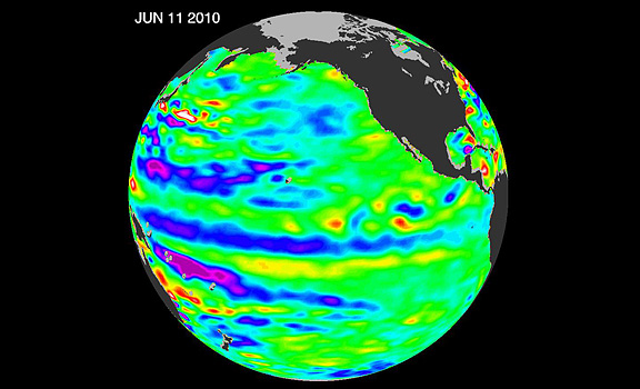 The latest image of Pacific Ocean sea surface heights from the NASA/European Ocean Surface Topography Mission/Jason-2 oceanography satellite, dated June 11, 2010, shows that the tropical Pacific has switched from warm (red) to cold (blue) during the last few months. The blue area in the center of the image depicts the recent appearance of cold water hugging the equator, which the satellite measures as a region of lower-than-normal sea level. Remnants of the El Nino warm water pool, shown here in red and yellow, still linger north and south of the equator in the center of the image. The image shows sea surface height relative to normal ocean conditions. Red (warmer) areas are about 10 centimeters (4 inches) above normal. Green areas indicate near-normal conditions. Purple (cooler) areas are 14 to 18 centimeters (6 to 7 inches) below normal. Blue areas are 5 to 13 centimeters (2 to 5 inches) below normal.