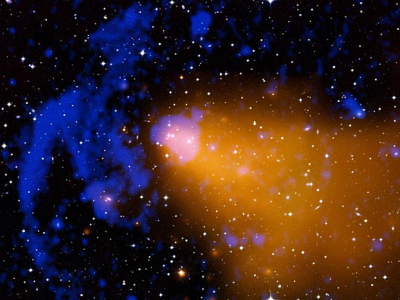 This composite image of the Abell 3376 galaxy cluster shows X-ray data from the Chandra X-ray Observatory and the ROSAT telescope in gold, an optical image from the Digitized Sky Survey in red, green and blue, and a radio image from the VLA in blue. The bullet-like appearance of the X-ray data is caused by a merger, as material flows into the galaxy cluster from the right side. The giant radio arcs on the left side of the image may be caused by shock waves generated by this merger.