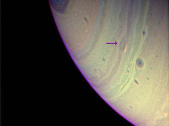 In contrast with the large and long-lasting anticyclones on Jupiter, the cyclone on Saturn has a weak circulation, with properties very similar to those in its immediate environment.