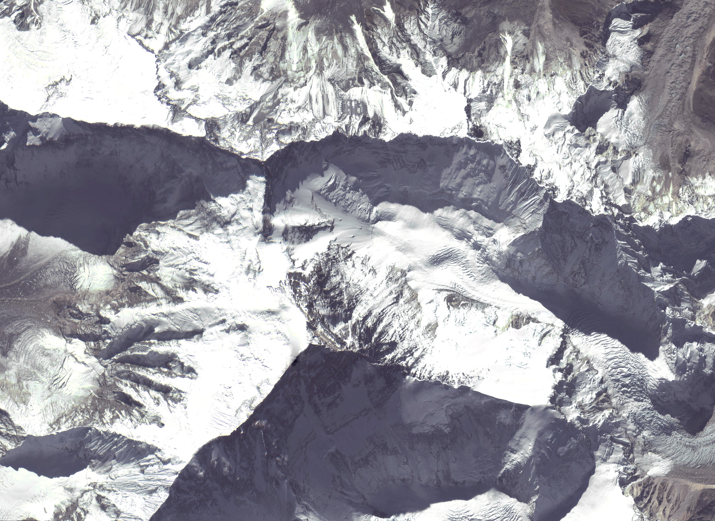 This image, captured by GeoEye’s Ikonos satellite on November 29, 2001, shows an approximation of the route Hillary and Norgay followed, and some of the challenges Hillary and Norgay (and hundreds of later climbers) faced as they summited Mount Everest. The two climbers, Hillary from New Zealand and Norgay from Nepal, were part of a British climbing team. The team made their first camp below the Khumbu Ice Fall, a steep, rugged, and fast-moving section of the Khumbu Glacier. The dark lines that cut across the icefall resemble waves, hinting at the constant movement that opens deep crevasses and sends large chunks of ice tumbling freely down the mountain. After successfully crossing the Khumbu Icefall, the team walked up the Western Cwm.