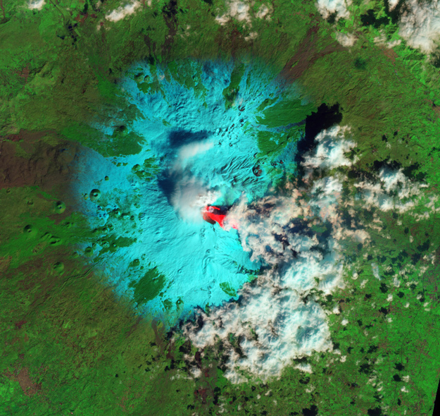 In the image, fresh lava is bright red, as the hot surface emits enough energy to saturate the instrument’s shortwave infrared detectors but is dark in near-infrared and green light. Snow is blue-green because it absorbs shortwave infrared light, but reflects near-infrared and green light. Clouds made of water droplets (not ice crystals) reflect all three wavelengths of light similarly and appear white. Forests and other vegetation reflect near-infrared more strongly than shortwave infrared and green, and so appear green. Dark gray areas are lightly vegetated lava flows, 30 to 350 years old.