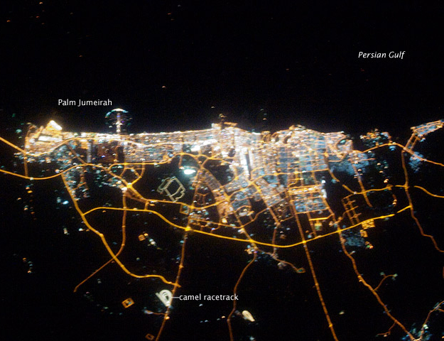 This nighttime astronaut photograph of the city of Dubai was taken at approximately 2 a.m. local time on September 11, 2009. Orange sodium vapor lights trace the major highways and street grid in and around the metropolitan area, while grey-white mercury vapor lamps fill in the commercial and residential areas. The lighted islands and peninsula of Palm Jumeirah are clearly visible along the coastline. A spiral pattern of lights on the southeastern fringe of the urban area is a camel racetrack. Nighttime images like these are useful to climate modelers, urban planners, and geographers as they allow for simple definition of urban (densely lit) and rural (sparely lit) areas.