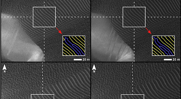 One report is by Simone Silvestro of the International Research School of Planetary Sciences at Italy’s G. d’Annunzio University, and his collaborators. They investigated migration of ripples and other features on dark dunes within the Nili Patera area of Mars’ northern hemisphere. They compared an image taken on Oct. 13, 2007, with another of the same dunes taken on June 30, 2007. Most of the dunes in the study area are hundreds of meters long. Ripples form patterns on the surfaces of the dunes, with crests of roughly parallel ripples spaced a few meters apart.
