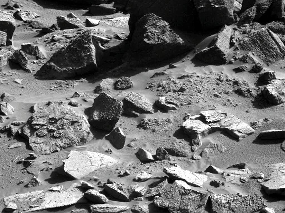The instruments on the rover’s robotic arm (IDD) have been investigating targets on the rock called “Chocolate Hills.” This rock is of interest because it exhibits a dark rind or crust that may be impact melt. On Sol 2152 (Feb. 11, 2010), the rover made a small turn to reposition the robotic arm for targets on the surface of the Chocolate Hills.