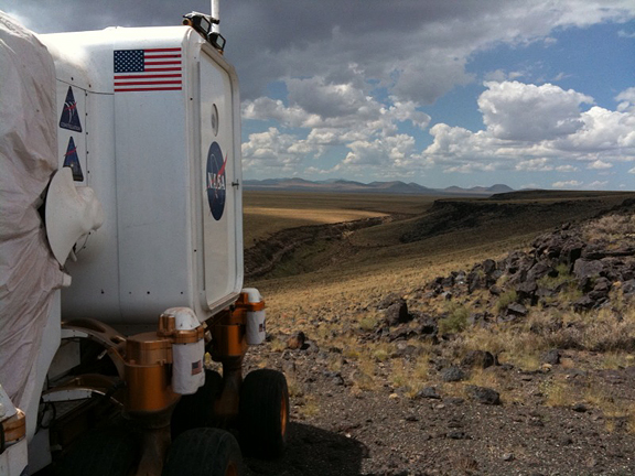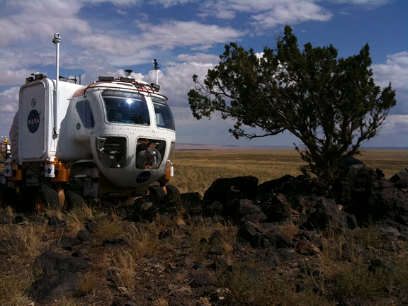 BLACK POINT LAVA FLOW, AZ (NASA EDGE PRESS): Life moves pretty fast across the lava flow in Arizona for the NASA Desert Research and Technology Studies Team (D-RATS.) At approximately 7:00am local time, NASA EDGE Set Therapist and Everyman were separated from their more studious counterparts and whisked away to the remote LER testing area by D-RATS taskmasters Joe Kosmo and Barbara Romig for exclusive coverage of the eighth day of a 14 day mission.