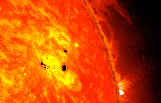 The bottom two black spots on the sun, known as sunspots, appeared quickly over the course of Feb. 19-20, 2013. These two sunspots are part of the same system and are over six Earths across. This image combines images from two instruments on NASA’s Solar Dynamics Observatory (SDO): the Helioseismic and Magnetic Imager (HMI), which takes pictures in visible light that show sunspots and the Advanced Imaging Assembly (AIA), which took an image in the 304 Angstrom wavelength showing the lower atmosphere of the sun, which is colorized in red. Credit: NASA/SDO/AIA/HMI/Goddard Space Flight Center
