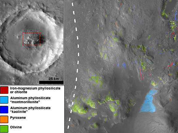 The researchers used the Compact Reconnaissance Imaging Spectrometer for Mars (CRISM), an instrument on the Mars Reconnaissance Orbiter, to check 91 craters in the northern lowlands. In at least nine, they found clays and clay-like minerals called phyllosilicates, or other hydrated silicates that form in wet environments on the surface or underground.
