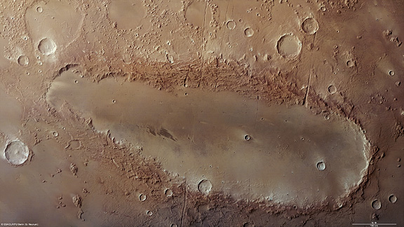 The existence of tectonic forces at Orcus Patera is evident from the presence of the numerous ‘graben’, rift-valley-like structures that cut across its rim. Up to 2.5 km wide, these graben are oriented roughly east-west and are only visible on the rim and the nearby surroundings.