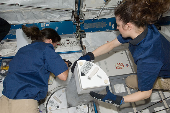 NASA astronauts Tracy Caldwell Dyson (right) and Shannon Walker, both Expedition 24 flight engineers, prepare to insert biological samples in a dewar tray in the Minus Eighty Laboratory Freezer for ISS (MELFI-1) in the Kibo laboratory of the International Space Station. high res (1.7 M) low res (93 K)