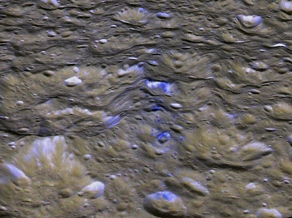 This perspective view shows one of a series of relatively blue patches that form a very narrow band only 10 kilometers wide that straddles Rhea’s equator. This view was created using stereo topography generated by Dr. Paul Schenk (http://www.lpi.usra.edu/lpi/schenk/) of the Lunar and Planetary Institute in Houston Texas from Cassini imaging data returned in 2008. The bluish material is believed to be fresh ice re-exposed when material from Rhea’s ring struck the surface along the equator, and is a target of investigation for the March 2 Cassini flyby of Rhea. The smaller craters with the bluish deposits in the center of the frame are about 3 to 10 kilometers wide and less than one kilometer deep. This view is looking toward the west along the equator. The colors have been enhanced to highlight the color differences between these patches and the more typical cratered terrains of Rhea.