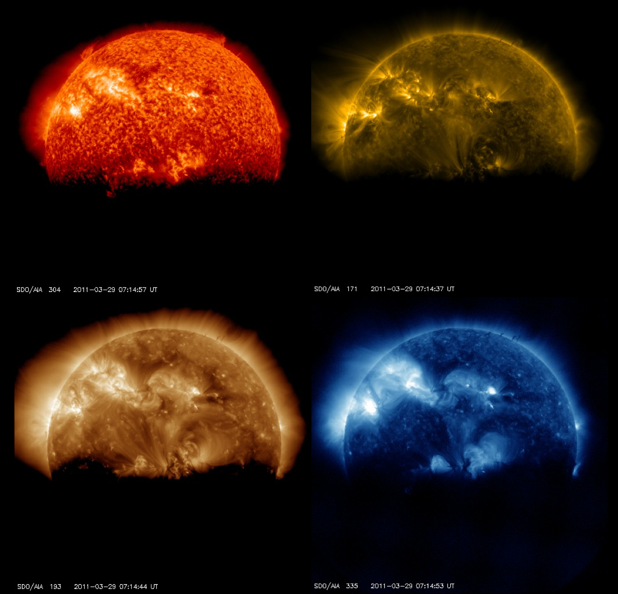 Two topics need to be covered this week. We”ll do one today. What happened while SDO exited the eclipse on March 29? The pictures at the left show images in four AIA wavelengths (304, 171, 193, and 335) at about 07:14:50 UT Tuesday. The edge of the Earth is the ragged line across the southern hemisphere of the Sun. Where is the sharp line seen in the HMI movie from the FirstLight gallery or the edge of the moon in a lunar transit?