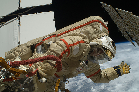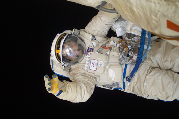 Russian cosmonauts Oleg Kotov and Maxim Suraev (out of frame), both Expedition 22 flight engineers, participate in a session of extravehicular activity (EVA) as maintenance and construction continue on the International Space Station. During the spacewalk, Kotov and Suraev prepared the Mini-Research Module 2 (MRM2), known as Poisk, for future Russian vehicle dockings. Suraev and NASA astronaut Jeffrey Williams, commander, will be the first to use the new docking port when they relocate their Soyuz TMA-16 spacecraft from the aft port of the Zvezda Service Module on Jan. 21. Earth’s horizon and the blackness of space provide the backdrop for the scene. high res (1.1 M) low res (94 K)