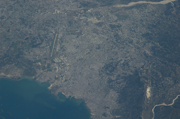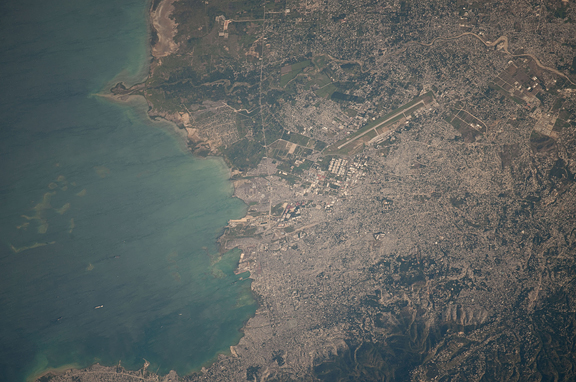 An Expedition 22 crew member onboard the International Space Station took this image of the 260-year-old city Port-au-Prince on Jan. 18, 2010 when they could view the area. This was a few days after the major Haitian earthquake occurred and brought devastation to Port-au-Prince, Carrefour, and the surrounding region. The Toussaint Louverture International Airport, clearly visible on the north side of Port-au-Prince, is the central focal point of incoming international aid. The population of Port-au-Prince is estimated to be between 2.5 to 3 million people. The photo was taken with an 800 mm lens setting. high res (1.1 M) low res (73 K)