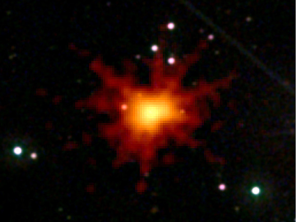 The brightest gamma-ray burst ever seen in X-rays temporarily blinded Swift’s X-ray Telescope on 21 June 2010. This image merges the X-rays (red to yellow) with the same view from Swift’s Ultraviolet/Optical Telescope, which showed nothing extraordinary. (The image is 5 arcminutes across.) Credit: NASA/Swift/Stefan Immler