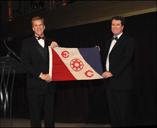 Scott Parazynski presents Flag #114 to Explorers Club President Daniel Bennett at the 2008 Lowell Thomas Annual Dinner. This flag was carried to the summit of Mt. Everest by Adam Janikowski.