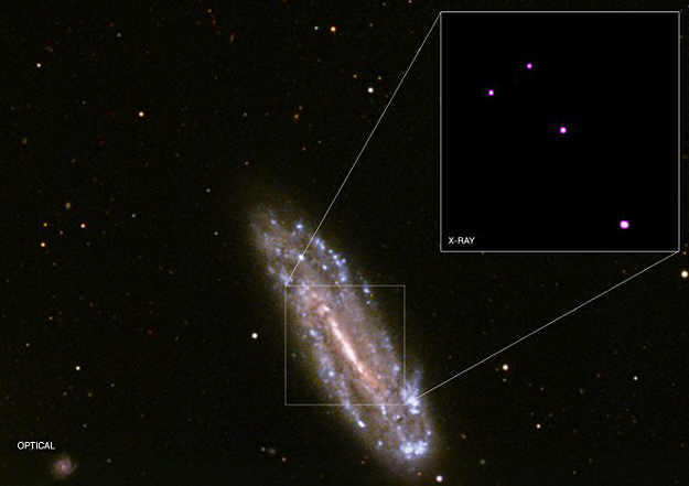 The black hole is located in the middle of the spiral galaxy NGC 4178, shown in this image from the Sloan Digital Sky Survey. The inset shows an X-ray source at the position of the black hole, in the center of a Chandra image. An analysis of the Chandra data, along with infrared data from NASA’s Spitzer Space Telescope and radio data from the NSF’s Very Large Array, suggests that the black hole is near the extreme low-mass end of the supermassive black hole range.