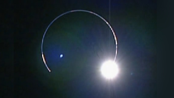 According to JAXA “On Feb. 10 the lunar explorer “KAGUYA” successfully took an image of the moment when the Earth looked like a diamond ring by its onboard high definition camera. The moment came when a penumbral lunar eclipse occurred and the view of the Sun from the KAGUYA was mostly covered by the Earth, thus the earth looked like a diamond ring. This is the first time that this phenomenon was shot from the Moon.”