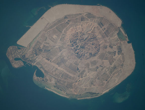 Sir Bani Yas Island is featured in this image photographed by an Expedition 22 crew member on the International Space Station. Sir Bani Yas Island is located in the Persian Gulf near the western coastline of the United Arab Emirates (UAE). The approximately 14-kilometers x nine-kilometers island is the surface expression of a salt dome, and is one of several such islands in the Persian Gulf.