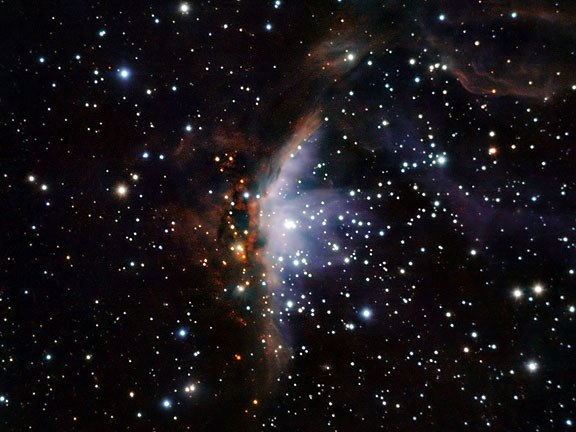 The furnace that fuels Gum 19’s luminosity is a gigantic, superhot star called V391 Velorum. Shining brightest in the scorching blue range of visible light, V391 Velorum boasts a surface temperature in the vicinity of 30,000 degrees Celsius. This massive star has a temperamental nature, however, and is categorized as a variable star accordingly. V391 Velorum’s brightness can fluctuate suddenly as a result of strong activity that can include ejections of shells of matter, which contribute to Gum 19’s composition and light emissions.