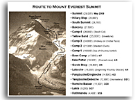 This map of the South Face of Mt. Everest (click for larger version) shows the route that Scott and his team will be taking as they head for the summit. There is also a listing of stops along the way as he treks in to Everest Base Camp.