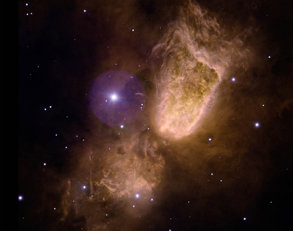Known as Sharpless 2-106 (Sh2-106), the hourglass-shaped nebula in the new Gemini image is a stellar nursery made up of glowing gas and light-scattering dust. The material shrouds a natal high-mass star thought to be mostly responsible for the hourglass (bipolar) shape of the nebula due to high-speed winds (at more than 200 kilometers/second) which eject material from the forming star deep within. Research also indicates that many sub-stellar objects are forming within the cloud and may someday result in a cluster of 50 to 150 stars in this region.