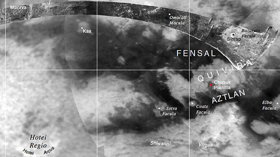 The descripter term planitia has been approved for use on Titan with the theme “Names of planets from the Dune series of science fiction novels by American author Frank Herbert (1920 – 1986).” The first planitia name on Titan has also been approved; Chusuk Planitia is located at 5.0S, 23.5W. For more information, see the list of Titan planitia names and the Titan images showing named features in the Gazetteer of Planetary Nomenclature.