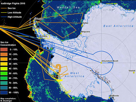 A compilation of flight lines shows the paths of all 10 flights flown during Operation IceBridge’s Antarctic 2010 campaign. Credit: Michael Studinger