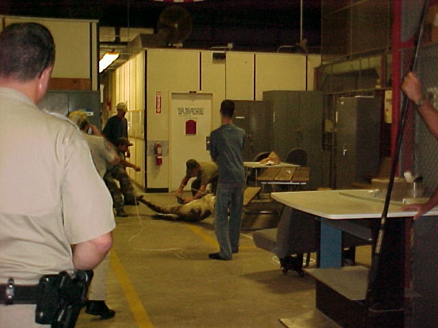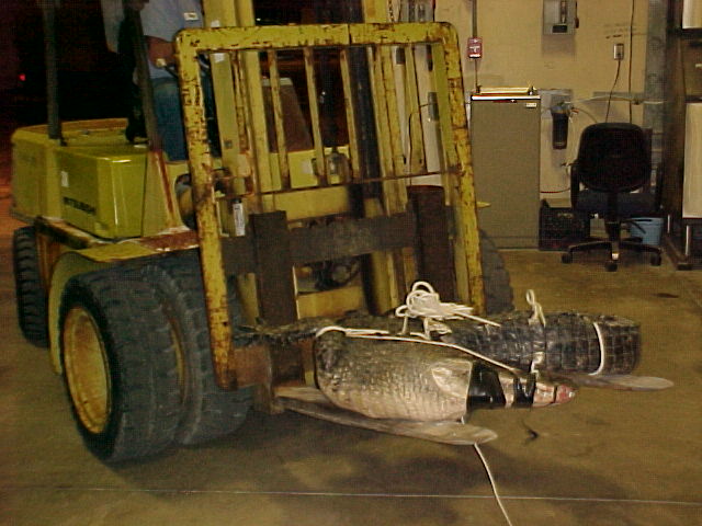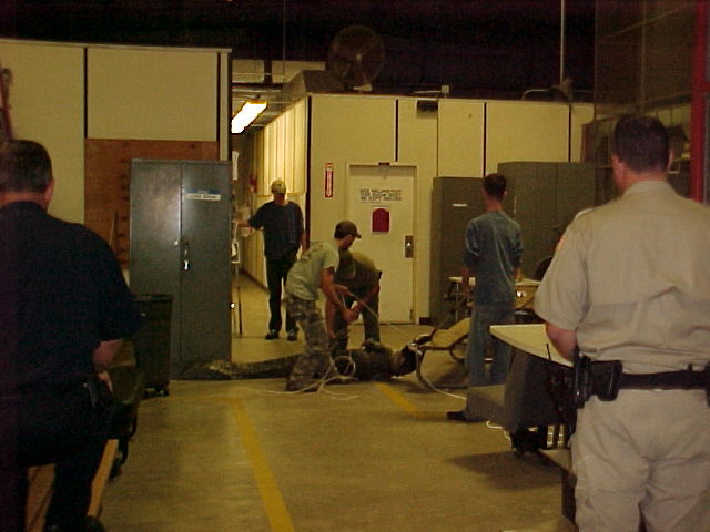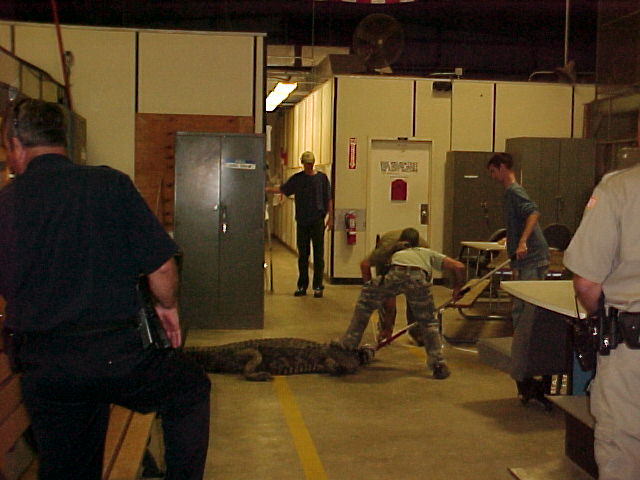From someone@nasa.gov: Hi Keith, I’d suggest that you call NASA public affairs to confirm this, but somewhere between KSC and JSC, the location of these photos apparently got promoted. I’m told that they were taken on May 14, at a receiving warehouse in the KSC industrial area, several miles south of the VAB. Gator encounters are a common occurrence here, given that we’re situated in the middle of a wildlife refuge. Still, it’s rare for them to venture inside.