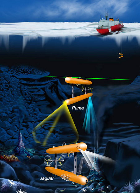 Two autonomous underwater vehicles (AUVs), called Jaguar and Puma, funded by the Astrobiology Science and Technology for Exploring Planets (ASTEP) program, were deployed on the Woods Hole Oceanographic Institution’s (WHOI’s) Arctic Gakkel Vents Expedition (AGAVE). The AGAVE team traveled to the Arctic Ocean last summer to study the Gakkel Ridge, a largely unexplored area of the mid-ocean ridge system.