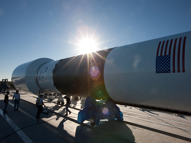 Falcon 9 is now fully integrated at the Cape! Today we mated the 5.2 m payload fairing to the Falcon 9 first stage (see below). This was the final step in the integration process–one day ahead of schedule.
