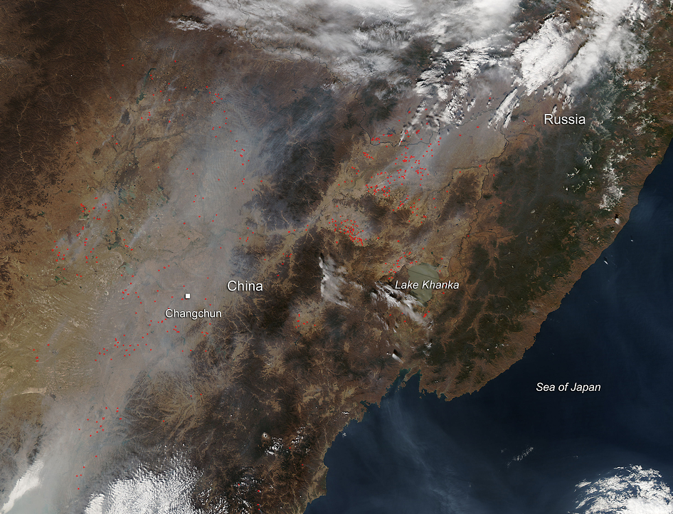 China is a well-known user of fire to clear agricultural fields of debris.  In this satellite image hundreds of hot spots fill the image. These hot spots are where the thermal detectors on the MODIS instrument recognized temperatures higher than background.  When accompanied by smoke, as in this image, they  indicative of fire.