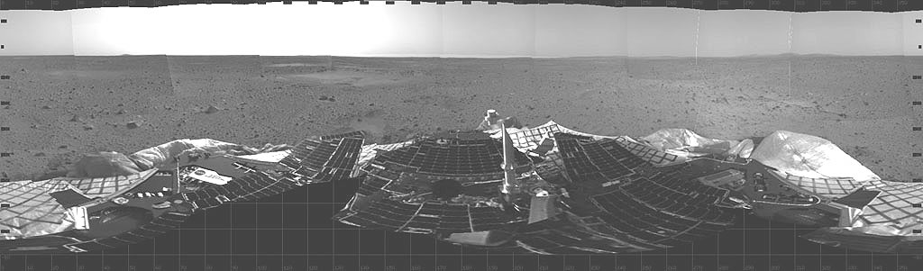This mosaic image taken by the navigation camera on the Mars Exploration Rover Spirit shows a 360 degree panoramic view of the rover on the surface of Mars.