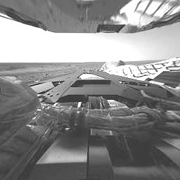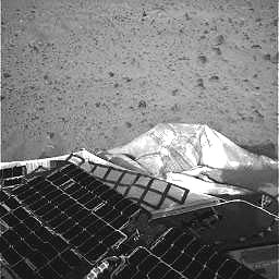 This image taken by the hazard avoidance camera on the Mars Exploration Rover Spirit shows the rover’s rear lander petal and, in the background, the Martian horizon. Spirit took the picture right after successfully landing on the surface of Mars.