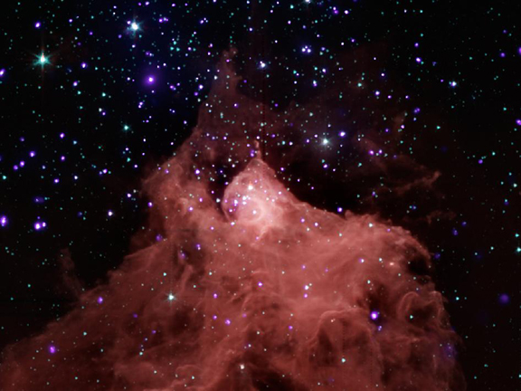This composite image, created using data from the Chandra X-ray Observatory and the Spitzer Space Telescope, shows the molecular cloud Cepheus B, located in our galaxy about 2,400 light years from the Earth. A molecular cloud is a region containing cool interstellar gas and dust left over from the formation of the galaxy and mostly contains molecular hydrogen. The Spitzer data, in red, green and blue shows the molecular cloud (in the bottom part of the image) plus young stars in and around Cepheus B, and the Chandra data in violet shows the young stars in the field.