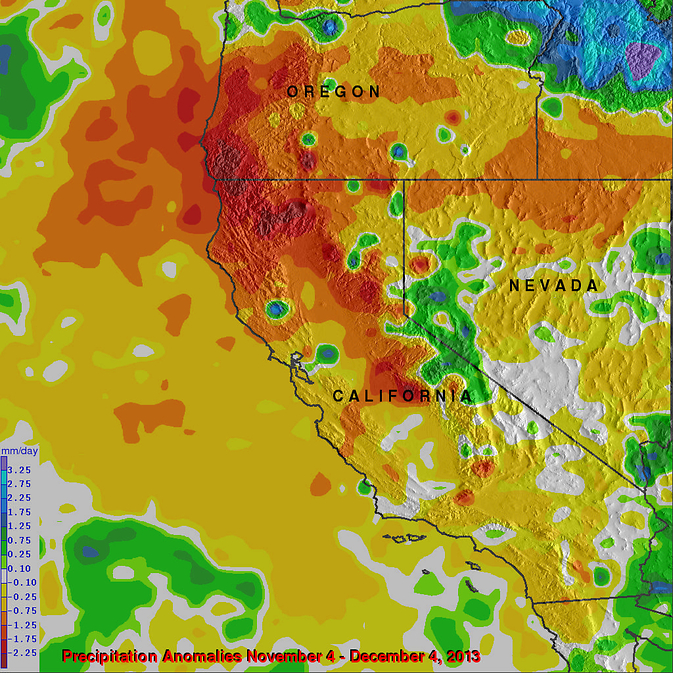 The rainfall analysis created at NASA showed estimates of total precipitation that fell over the western United States during the past month, from Nov. 4 to Dec. 4, 2014. Northern California received the most precipitation. This analysis indicated that downpours over the past few weeks had dropped totals of over 300 mm (11.8 inches) in some areas. Heavy precipitation that fell at higher elevations will add to snow pack totals.