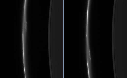 These two images, taken about eight minutes apart, show clump-like structures and a great deal of dust in Saturn’s ever-changing F ring. The images show an object-interior to and detached from the bright core of the F ring that appears to be breaking up into discrete clumps.