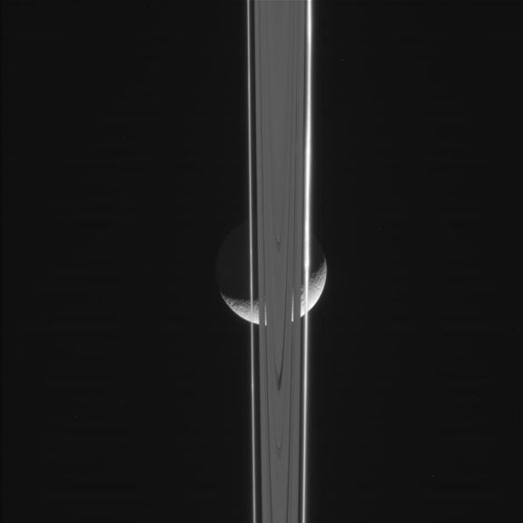 NASA Cassini Image: Rhea Behind Saturn’s Rings 07-03-2006
