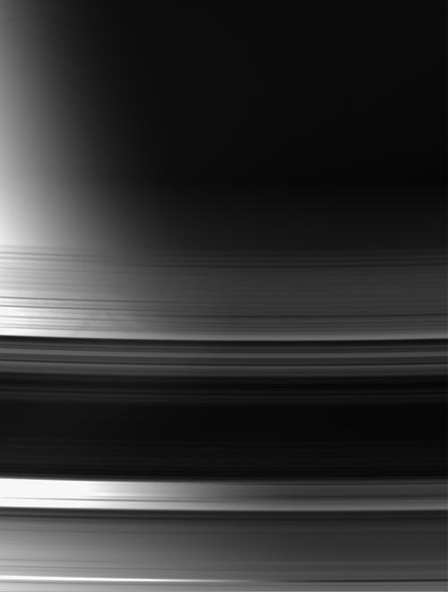 With Saturn’s terminator as a backdrop, this view of the unlit face of the rings makes it easy to distinguish between areas that are actual gaps, where light passes through essentially unimpeded, and areas where the rings block or scatter light. The gaps are regions in which the brightness varies strongly from left to right as the background goes from bright to dark. Parts of the image are saturated at left.