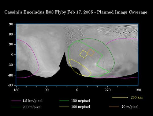 This map of the surface of Saturn’s moon Enceladus illustrates the regions that will be imaged by Cassini during the spacecraft’s first very close flyby of the moon on Feb. 17, 2005. At closest approach, the spacecraft is expected to pass approximately 1,180 kilometers (733 miles) above the moon’s surface. Enceladus is 505 kilometers (314 miles) across.