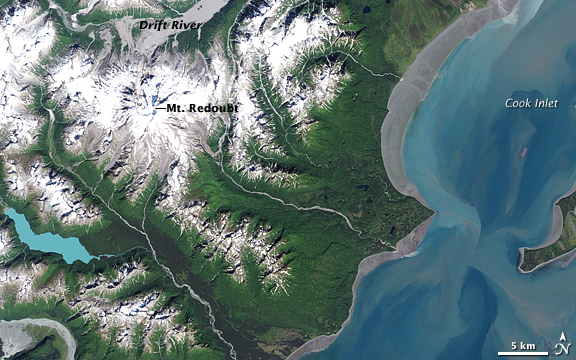 This image, taken by the Landsat satellite on August 16, 2000, illustrates some of the potential hazards associated with an eruption. Even in late summer, the volcano was covered in snow. As hot gases and lava erupt from the volcano, the snow will melt, possibly sending floods of water and debris down the mountain. These volcanic floods are called lahars, and a lahar from Redoubt would likely travel down the Drift River, which drains the volcano on the north. The volcanic flood could reach Cook Inlet, shown on the right side of the image. Such flooding on the Drift River is not unprecedented. Snow and ice melt during the eruption of 1989-90 created dramatic flooding on the nearby Drift River, which interrupted work at the Drift River Oil Terminal, Hard told NASA Earth Science Video Producer Jefferson Beck.