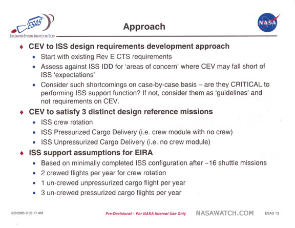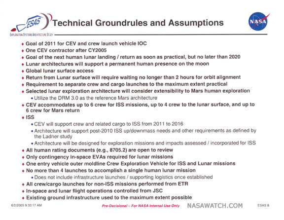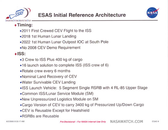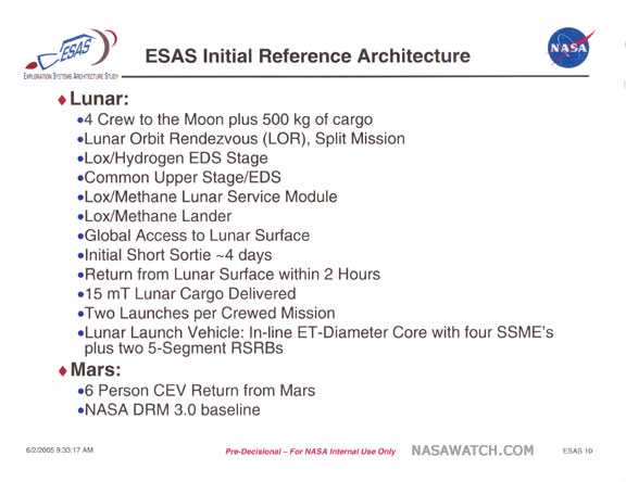 Editor’s note: These charts were part of a series of internal presentations made at NASA during June 2005 on the progress of the Exploration Systems Architecture Study.