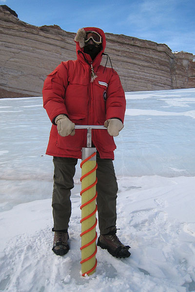 Jen Heldmann taking a core of the large snowpack. This is a completely manual process of twisting a big tube (with cutters on the bottom) into the ice. The depth of our core was about a meter (3-4 ft). Credit: M. Marinova