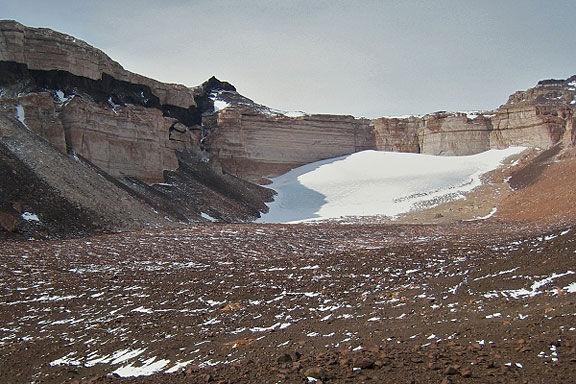 University Valley with the snowpack at the head of the valley. Note the little bits of remaining snow: the amount of snow on the ground is greatest near the snowpack and decreases towards the mouth of the valley. Credit: M. Marinova