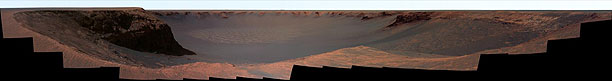 NASA’s Mars Exploration Rover Opportunity captured this vista of “Victoria Crater” from the viewpoint of “Cape Verde,” one of the promontories that are part of the scalloped rim of the crater. Opportunity drove onto Cape Verde shortly after arriving at the rim of Victoria in September 2006. The view combines hundreds of exposures taken by the rover’s panoramic camera (Pancam).