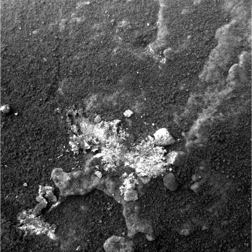 Given the exceptional repeatability in positioning the robotic arm, engineers were able to transmit the desired coordinates for further study and direct the rover to place the alpha particle X-ray spectrometer and Mässbauer spectrometer in that particular spot, allowing analyses of the light-toned material. A subsequent microscopic image, 32 millimeters (1.2 inches) wide, of the target known as “Halley_Brunt,” acquired on sol 880 (June 24, 2006) and shown here, documented that the rover did, in fact, place both spectrometers in the optimum position and analyze the desired patch of sparkly material on the Martian surface.