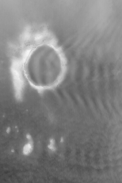 67 km (~42 mi) in diameter. Wavy clouds form to