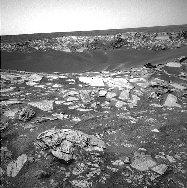Opportunity spent five sols this week at a target called “Joseph McCoy.” At this location, the rover acquired about 41 hours of Moessbauer spectrometer integration, almost seven hours of alpha particle X-ray spectrometer integration, and a mosaic from the microscopic imager. Then Opportunity rolled back, scuffed the soil, and drove 55 meters (180 feet) closer to “Beagle Crater.” The scuff helps scientists and engineers analyze how the wheels interact with the soil. After the most recent drive, Opportunity is sitting about 25 meters (82 feet) from the rim of Beagle Crater.