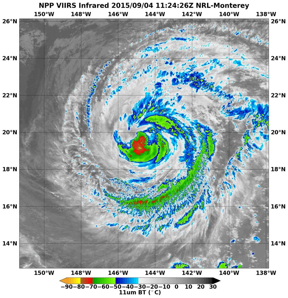 NOAA’s Central Pacific Hurricane Center (CPHC) said that water vapor imagery strongly suggests that very dry is being drawn into the system which will diminish the development of thunderstorms. In addition, CPHC noted that the outflow (air at the top of the storm being pushed to the fringes of the hurricane from the center) was “showing some restrictions in the western quadrant.” In the VIIRS image, the western quadrant lacked strong thunderstorms.